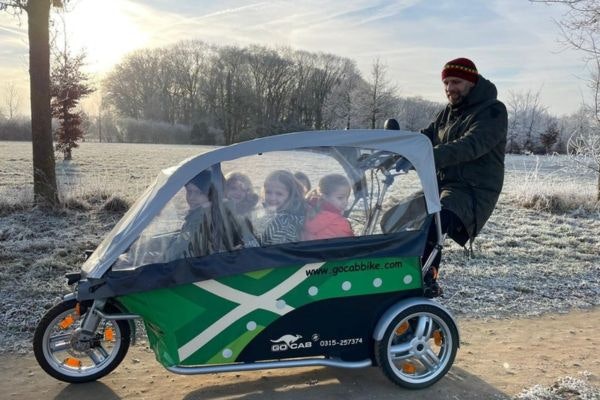 GoCab is a bicycle cab with electric support in which 8 children can be transported safely. Please contact us for more information.